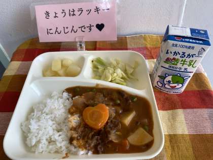 「ハヤシライス」は、子どもたちに大好評の献立の一つです。今日はバレンタインデーということで、調理員さんがハート💗型のラッキーにんじんを作ってくれました。子どもたちも「ハートや!バレンタインやからやで!」と喜んでいました。