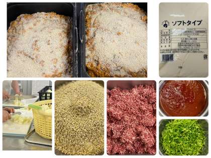 「とうふのミートグラタン」は主材に、とうふと牛ひき肉、大豆(粒状)を使用しています。粒状の大豆を使用することで、脂っぽさがおさえられた仕上がりになります。