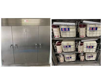 子どもたちが使用している食器は、食器消毒保管庫に入れ、給食運搬時まで清潔に保管されています。