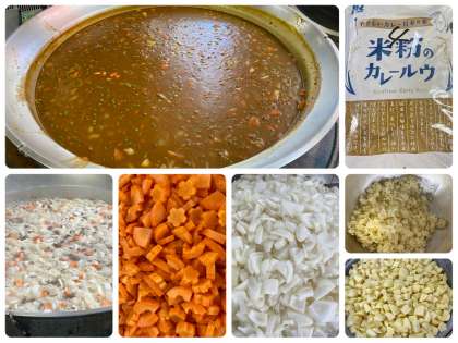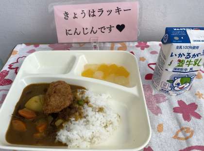 子どもたちに大好評のメニューです。4月からカレーライスは米粉のカレールウを使います。今日は調理員さんが桜のラッキーにんじんにしてくれました。