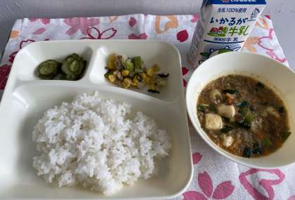 給食では、赤みそやしょうゆなどで味付けし、トウバンジャンで辛みをつけています。