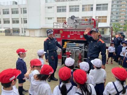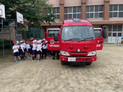 避難訓練の後、消防車を見学しました。