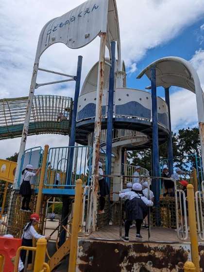 お弁当が終わったら、公園で遊びます。大きな遊具には、いろいろな滑り台があります。渦巻き型や少し長いローラー滑り台、幅の広い滑り台では横に4人並んで滑ることができました。