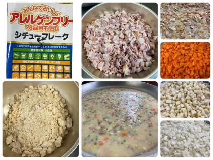 今日の「鶏肉とコーンのシチュー」は、新商品の「シチュールウの素」を使っています。小麦粉や牛乳・乳製品が入っていないため、小麦アレルギー、乳アレルギーのある人も食べることができます。