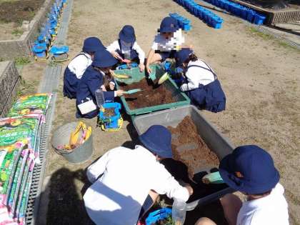 昨日に引き続き、今日の生活科の学習でミニトマトの苗を植えました。苗を大切に扱いながら自分の鉢植えに植えることができました。たくさん実ができるように、毎日水やりをします。美味しいミニトマトが育ちますように。