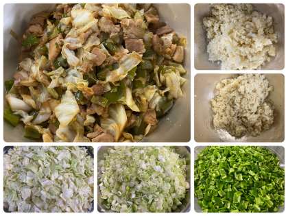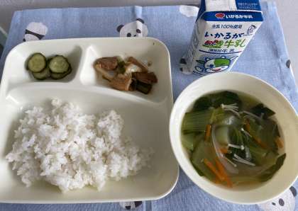 給食では、豚バラ肉をゆでてから、他の材料と一緒にいためています。