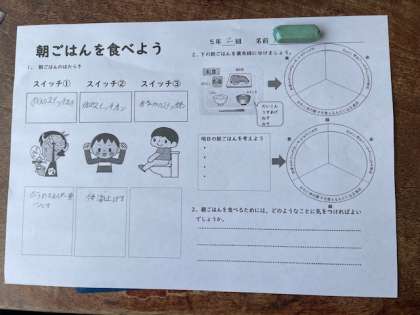 「朝ごはんをたべよう」の学習では、朝食を食べることの大切さについて学びました。