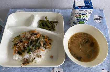「豚ひき肉とにらのそぼろ丼」は、しょうが、にんにく、にらの風味がよい丼に仕上がっていました。ごはんがすすむ、子どもたちにも好評な献立した。