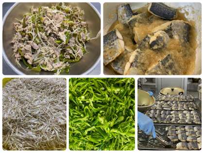 今日の給食のさごしは、大根おろしを使ったしょうゆだれを配缶時にかけます。とてもおいしいたれなのでお家の方でも作ってみてください。
