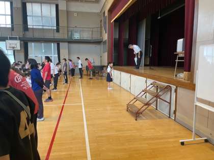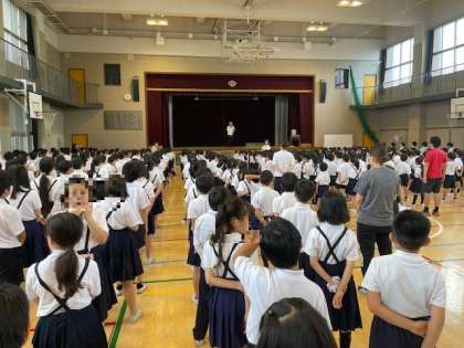 今日は雨模様の中、講堂で児童朝会を行いました。