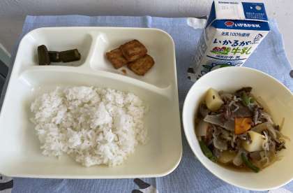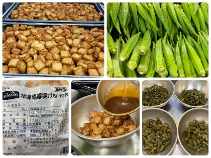 「肉じゃが」「あつあげのみそだれかけ」は子どもたちに好評な人気の献立です。それに、「オクラのおかかあえ」がつきました。オクラは、エジプトでは古くから食べられていました。切り口が★星★のような形をした緑色のものがよく出回っていますが、丸い形のものもあります。ビタミン類やカルシウム、食物繊維などが多く含んでいます。
