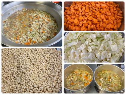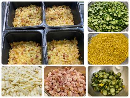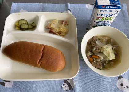 今日は、鶏肉を主材に、食物繊維と鉄が豊富に含まれているてぼ豆などを使った「鶏肉とてぼ豆のスープ煮」と砂糖、塩、ワインビネガー、うすくちしょうゆ、綿実油で作ったドレッシングであえた「きゅうりとコーンのサラダ」、ベーコンとじゃがいもに下味をつけ、ミニバットに入れチーズをのせて焼き物機で焼いた「ベーコンとじゃがいものチーズ焼き」でした。チーズには体を作るもとになるたんぱく質や、骨や歯をじょうぶにするカルシウムなどの栄養素が含まれています。たくさん食べたい食品です。