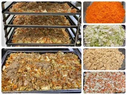 ささみ(水煮)、キャベツ、にんじん、ねりごま、砂糖、うすくちしょうゆ、白みそで作った調味液を混ぜ合わせ、いりごまをふり、焼き物機で焼きます。野菜と白みその甘みがマッチしてとても食べやすかったです。
