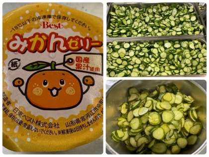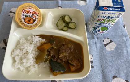 「夏野菜のカレーライス」には、夏野菜のかぼちゃ、なす、ピーマンなどを使用しています。子どもたちも「カレーにピーマンとなす入ってる!」「食べたことない!」などとびっくりしている子どもたちが多かったです。かぼちゃの甘みもありとても美味しいカレーでした。それに、口当たりのよいみかんゼリーとの組み合わせもよく大好評でした。