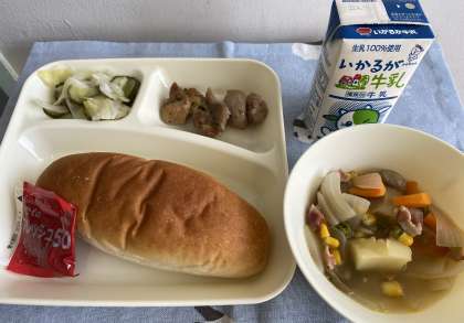 「ベーコンと野菜のスープ煮」は、ベーコンを主材に、じゃがいも、たまねぎ、にんじん、コーン、マッシュルーム、青みにグリンピースを使用した洋風の煮ものです。スープにベーコンと野菜の甘みがたっぷりと出ていてとても美味しかったです。