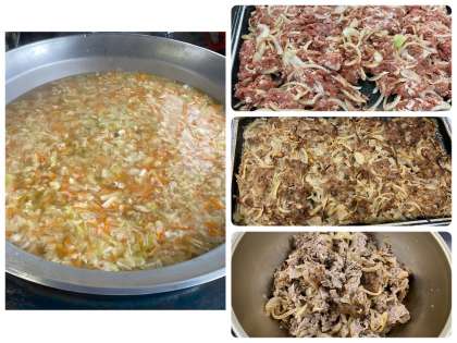 「豚肉のガーリック焼き」は豚肉にワイン、塩、こしょう(粗挽)、ガーリック、こいくちしょうゆオリーブ油で下味をつけ、玉ねぎを混ぜ合わせ、焼き物機で焼きました。