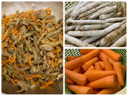 ごぼうは、主に根の部分を食べる野菜です。根が細くて長い種類のものがよく食べられています。ごぼうはおなかの調子を整える食物繊維を多く含んでいます。大阪府能登町高山地区では、なにわの伝統野菜「高山ごぼう」が江戸時代から作られています。給食でも登場してほしい食材です。きんぴらごぼうも大好評で、今日の給食も美味しく頂きました。