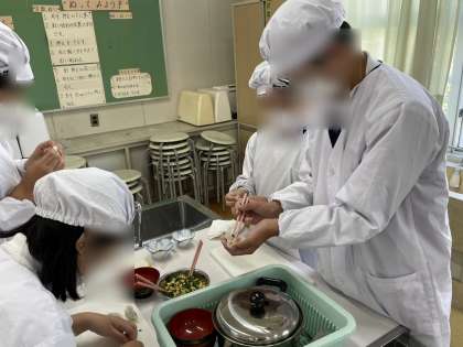 家庭科で、ご飯と汁物に合うものを作る調理実習をしました。今回は各グループそれぞれで料理や調理方法を調べ、考えて作りました。それもあってか、計画の段階からとても楽しみにしている子が多かったです。