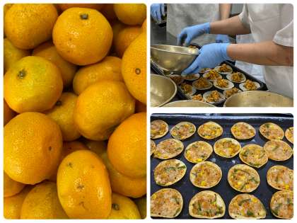 「変わりピザ」は、ツナ、コーン、ピーマン、ピザソース、チーズを混ざ合わせて、ぎょうざの皮にのせ、焼き物機で焼きました。児童に好評な献立です。