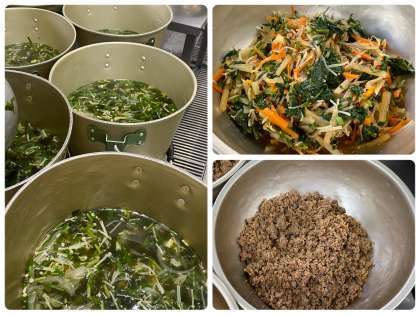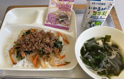 「ビビンバ」は韓国・朝鮮の混ぜご飯です。給食では、ごはんの上に野菜とお肉を盛り付けて食べます。ビビンバは子どもたちに大好評な献立で、わかめスープとも相性がよくとても美味しかったです。