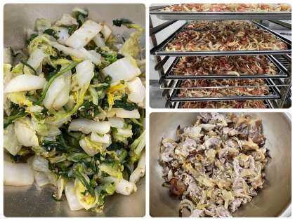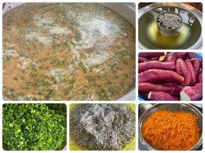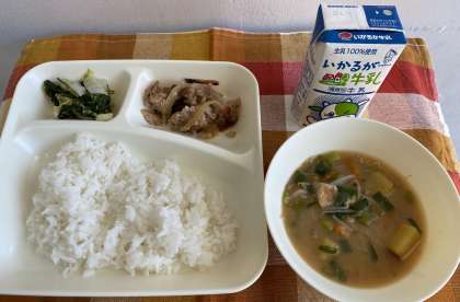 今日の「さつまいものみそ汁」は、にぼしでだしをとっています。こんぶや削り節でだしをとるのとはまた違い、にぼしの風味がよく出ていて、あっさりとしたみそ汁に仕上がっていました。これに、「豚肉のしょうが焼き」と「きくなとはくさいのごまあえ」がつき、ごはんのすすむ献立でした。
