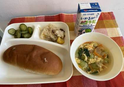 むかしは、もち米を蒸した飯を「かたいご飯」を意味する「強飯(こわいい)」と呼びました。それに、ていねい語の「お」をつけて短くし、「おこわ」と呼ばれるようになったといわれています。今日の給食は、焼き豚、くり、しいたけの入った「中華おこわ」でした。これに、「卵スープ」がつきました。除去食対応献立です。