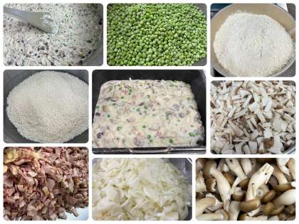 「きのこのドリア」は、しめじ、エリンギ、マッシュルームを使用し、ベーコンで旨みをクリームでコクを出しています。エリンギは、ヨーロッパなどで山や野に自然に生えているきのこです。日本では、、約30年前から作られるようになりました。コリコリとした歯触りがあわびに似ていることから「白あわびたけ」と呼ばれることもあります。
