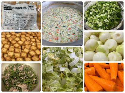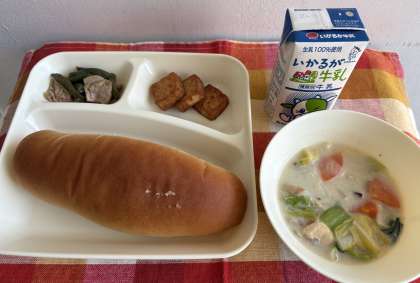 牛乳には、骨や歯をじょうぶにするカルシウム、筋肉や血を作るたんぱく質のほか、ビタミン類などが含まれています。今日は「はくさいのクリーム煮」に使用されています。クリームシチューとは違い作るのもあっさりとした味わいです。作るのも簡単で、野菜などをいため、湯を加えて煮、塩、白こしょう、うすくちしょうゆ、中華スープの素で味付けし、牛乳、クリームを加えて、水どきでんぷんでとろみをつけます。ご家庭にある調味料でできるので一度作っていただきたい献立です。