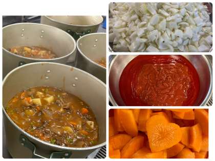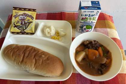 「ビーフシチュー」は児童に好評な献立です。水どき上新粉でとろみをつけ、調味料で味をつけています。今日のにんじんは、給食調理員さんがラッキーハート💗にしてくれました。いつもは星型☆が多いので、ハートのラッキーにんじんに興奮していました。