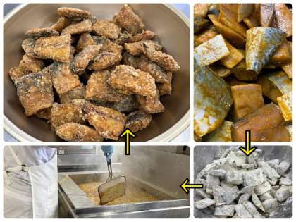 「さばのたつたあげ」は1人2切れのさばにしょうが汁、、料理酒、こいくちしょうゆ、カレー粉で下味をつけ、でんぷんをまぶし、油であげます。日本では、主に2種類のさばがとれます。