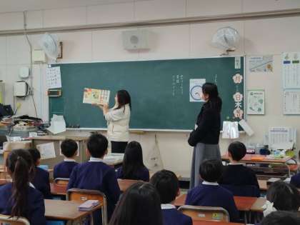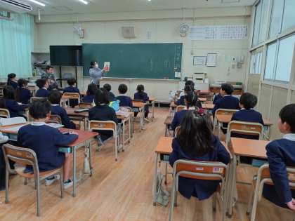 「よむよむさん」による、朝の読み聞かせのようすです。