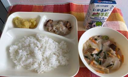 「鶏肉の塩こうじ焼き」は、令和5年度学校給食献立調理検討会議で開発された献立です。鶏肉に塩こうじで下味をつけ、たまねぎを混ぜ合わせ、焼き物機で焼きました。ごはんがすすむ味付けでした。