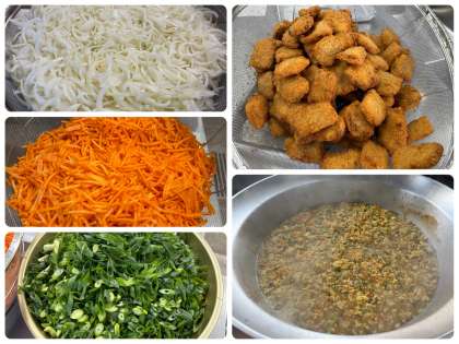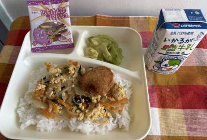 今日は【卵の除去食】でした。「カツ丼」は子どもたちに大人気の献立です。たまねぎ、にんじんは細切りにし、ねぎは斜め切りにしています。