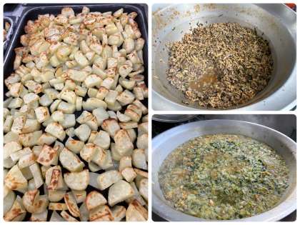 「豚肉と干しずいきのみそ煮」は、豚肉、干しずいき、うすあげ、青ねぎを使用し、砂糖、みりん、こいくちしょうゆ、赤みそで味つけした煮ものです。干しずいきはさといもの葉柄のことで、カルシウムや、鉄、食物繊維が多く含まれます。昔から食べられてきた乾物の一つです。