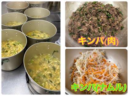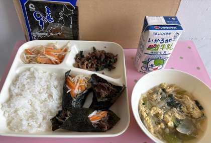 今日の献立は、令和5年度学校給食献立コンクール優秀賞に選ばれた献立でした。考えたねらいは、「キンパを給食で食べたいと思い考えました。自分で手巻するので、楽しく食べられます。」です。