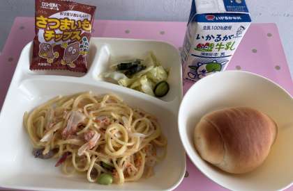 「さけのクリームスパゲッティ」は、紅ざけ(フレーク)を使用して春らしい淡いピンク色に仕上げ、むき枝豆で彩りよくしています。子どもたちにも大好評の献立です。