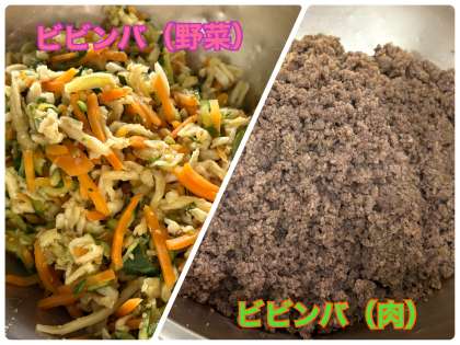 「ビビンバ」は、春のビビンバなので、きゅうり、にんじん、切干しだいこんを使用し、焼き物機で蒸しました。ごはんの上に野菜と肉をかけ、混ぜ合わせて食べます。子どもたちに好評な献立です。