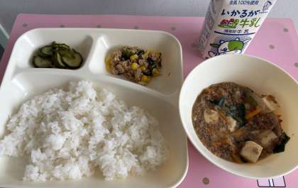 マーボーどうふは、中国の四川料理の代表的な料理です。とうがらしみそを使うのが特徴です。給食では、赤みそやしょうゆなどで味付けし、トウバンジャンで辛みをつけています。みそベースのマーボーどうふもとても美味しいので、お家でも試してみてください。