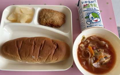ミネストローネとは、イタリア語で「具だくさん」という意味です。たまねぎやにんじん、トマトなどの野菜がたくさん入ったスープのことをいいます。今日の給食では、トマト缶やトマトピューレを使用しています。とても美味しくいただきました。
