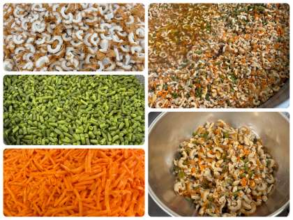 関西では、五目ご飯のことを「かやくご飯」と呼びます。今日の「かやくご飯」には、鶏肉、ちくわ、にんじん、さんどまめが入っています。ご飯やうどんに混ぜる具のことを「かやく」といいます。子どもたちにも大好評でした。