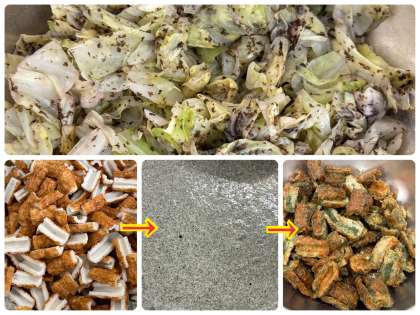 「いそべあげ」は、衣にのりを混ぜたり、材料にのりをまいたりして、あげた料理です。給食の「ちくわのいそべあげ」は、ちくわに小麦粉と青のりを混ぜた衣をつけてあげています。青のりの風味がよくとても美味しかったです。