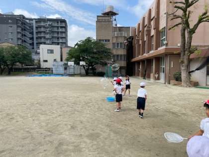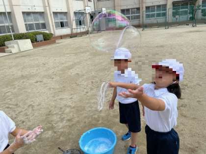 校庭にきれいなシャボン玉が無数に舞っていました!