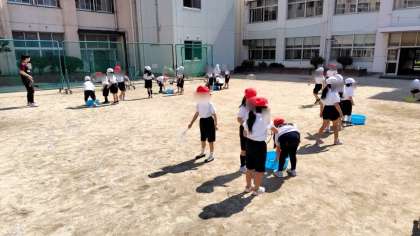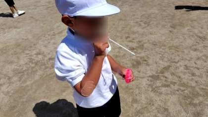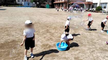 2つくっついて、雪だるまみたい!大きいシャボン玉の向こうにいる友達が中に入ってるみたい!と、楽しんでいました。