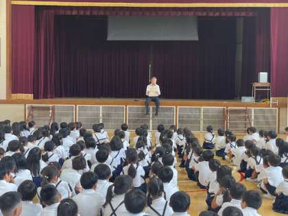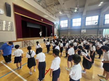 今日の児童朝会では、校長先生が子どもたちに学校生活についてのお話しがありました。