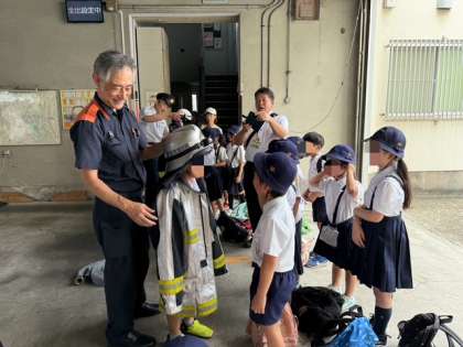 消火活動の時の服やホースなど、実際に使っているものも触ってみて、『こんなに重いの!!』と驚きとわくわくでいっぱいの見学になりました(^^)