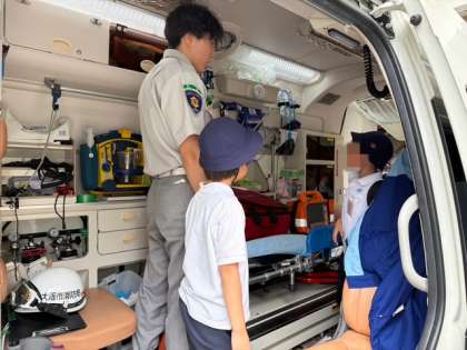 救急車や消防車、消防隊や救急隊のみなさんが働いている部屋などを案内していただき、見学しました!