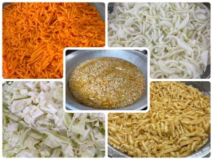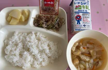 「ゴーヤチャンプルー」は年に1回だけ7月に使用できるにがうりを使った沖縄料理です。かつおぶしが1人1袋つきました。食べる前にかつおぶしをかけることで、風味と旨味を添えています。ゴーヤの苦みには、食欲をます働きがあるといわれています。