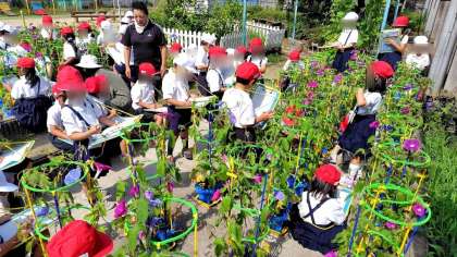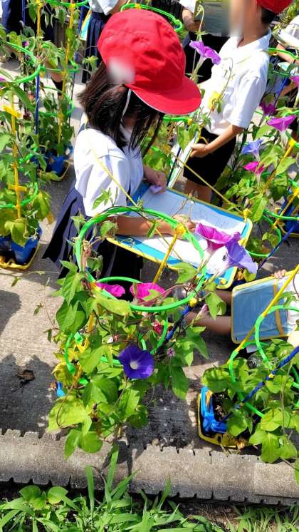アサガオがたくさん咲いたので、観察しにいきました。みんな、「いっぱい咲いてる!」と大喜び。咲いてなかった子も、「つぼみがいっぱい!何色か楽しみに!」と期待を膨らませていました。