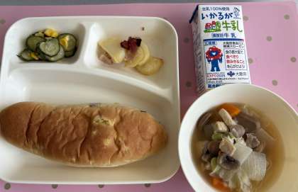 今日はじゃがいもとベーコンを使った「ジャーマンポテト」が出ました。子どもたちに大好評でした。