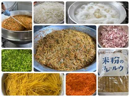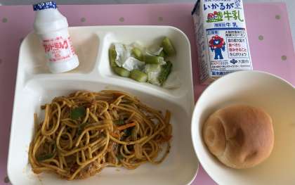 「カレースパゲッティ」は豚ひき肉を主材に、ベーコンで旨みを増し、カレールウの素などで味つけしたスパゲッティです。子どもたちに大好評な献立です。